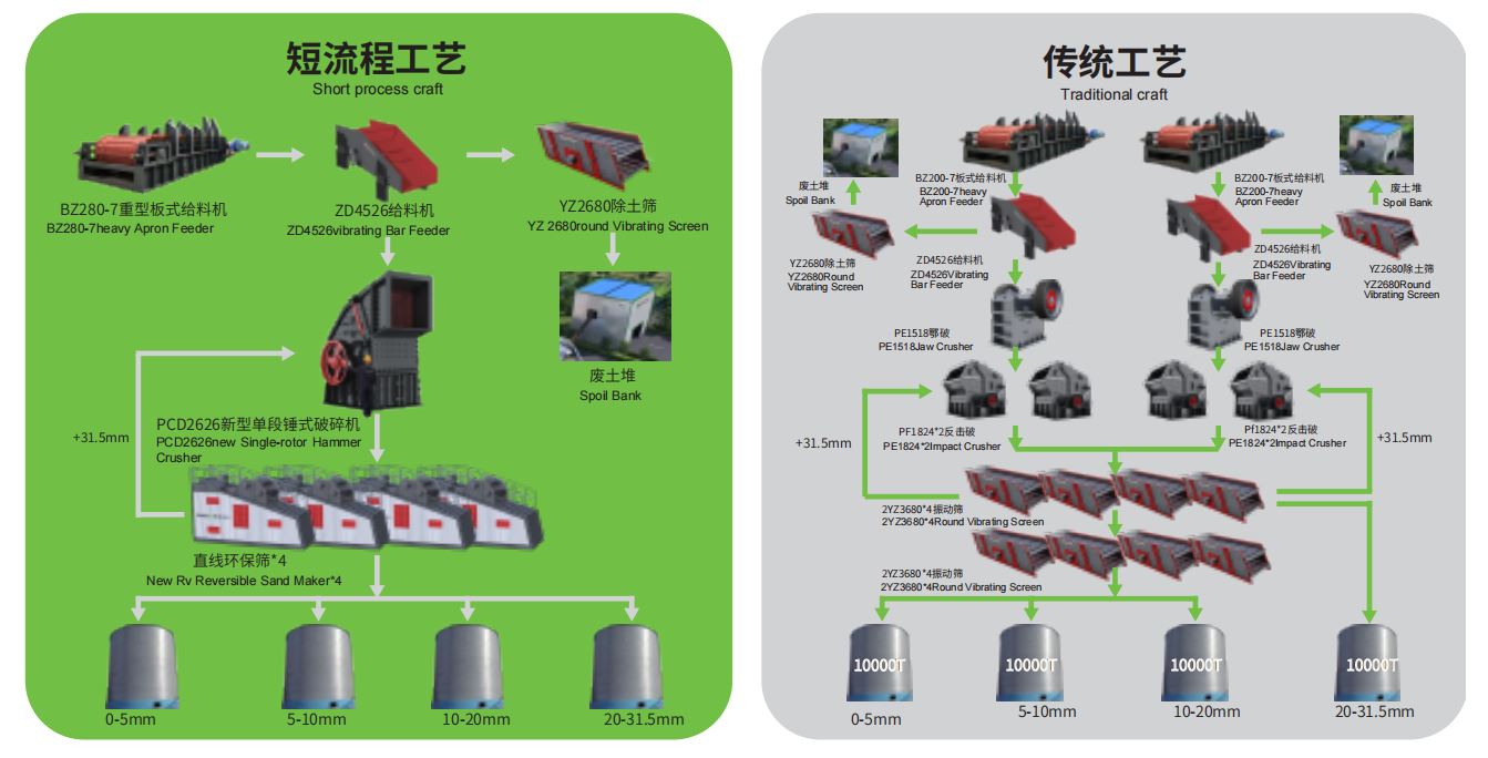 項(xiàng)目生產(chǎn)線采用鑫金山特有的高效節(jié)能短流程工藝,實(shí)現(xiàn)傳統(tǒng)多臺(tái)破碎機(jī)的產(chǎn)量,破碎比大,一次成型率高達(dá)80%的特性,生產(chǎn)工藝中無需配置回料破,進(jìn)一步節(jié)約了場(chǎng)地與能耗,大幅減少配套設(shè)備、土建、非標(biāo)、鋼構(gòu)、電氣等投入。同時(shí),揚(yáng)塵點(diǎn)與檢修點(diǎn)也相應(yīng)減少,降低了環(huán)保與檢修壓力。