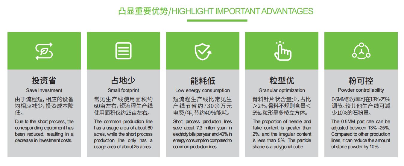 項(xiàng)目生產(chǎn)線采用鑫金山特有的高效節(jié)能短流程工藝,實(shí)現(xiàn)傳統(tǒng)多臺(tái)破碎機(jī)的產(chǎn)量,破碎比大,一次成型率高達(dá)80%的特性,生產(chǎn)工藝中無需配置回料破,進(jìn)一步節(jié)約了場(chǎng)地與能耗,大幅減少配套設(shè)備、土建、非標(biāo)、鋼構(gòu)、電氣等投入。同時(shí),揚(yáng)塵點(diǎn)與檢修點(diǎn)也相應(yīng)減少,降低了環(huán)保與檢修壓力。
